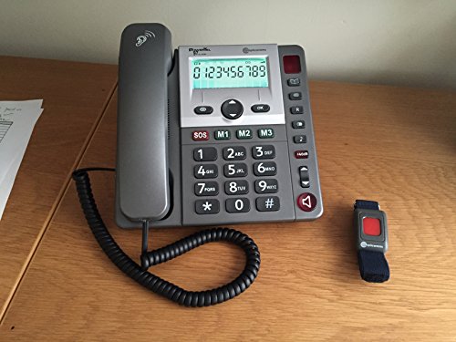 Easy to use Big Button Corded phone with a wireless SOS transmitter, premium hearing aid compatibility due to integrated induction coil, receiving volume up to 40dB, ringer volume up to 90dB, Voice assisted menu (DE/GB/FR/NL/IT/ES), Alarm transmitter can be worn with a wrist or neck strap, Press the alarm button to dial the numbers stored under M1/M2/M3