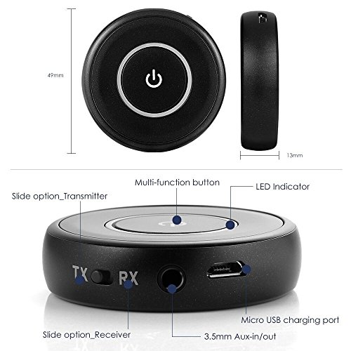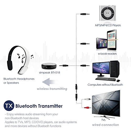 Bluetooth Transmitter — Transmit music from your non-Bluetooth MP3/CD players/car audio systems/TVs/e-readers to your Bluetooth receiver (Bluetooth heteadset/speaker) when you use it as Bluetooth transmitter