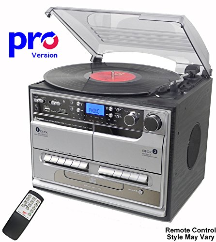 Features: (1) 3 Speed Record Turntable, plays 33, 45 & 78 rpm records, albums & singles — (2) CD Player — (3) FM Radio — (4) AM (MW) Radio — (5) Playback & Encode RECORDING to USB Stick (MP3 Format, now up to 16Gb) — (6) Playback & Encode RECORDING to SD Memory Card (MP3 Format, now up to 16Gb) — (7) TWIN Cassette Player & RECORDER, records from CD’s & Cassettes to 2nd tape deck — (8) Bluetooth