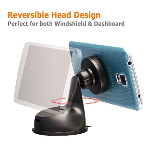 Reversible Head Design – Magnetic Head swivels to help you find the comfortable viewing angle when following the GPS or for handsfree talking. Top is reversible so you can lean a larger phablet against the base for additional stability.