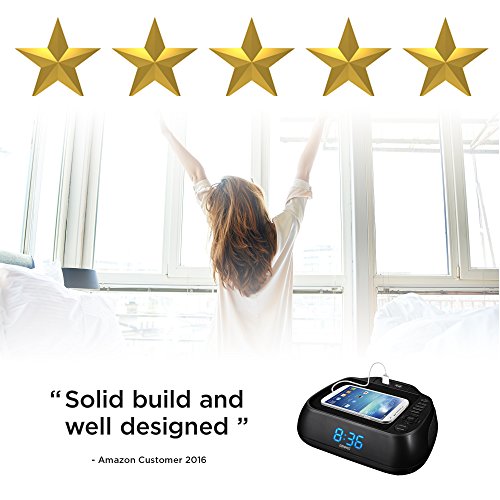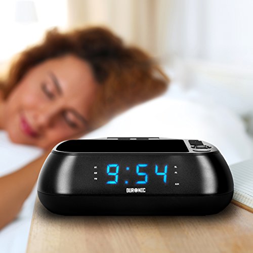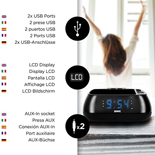 Our Alarm Clock Radio gives you the choice of waking up to your favourite radio station or a buzzer and includes a large soft blue LED display which makes it easy to tell the time, and a dimmer function for comforting night time use. The two USB ports allow you to charge up to two different compatible devices at once, these devices could be your smartphone manufacturer such as Apple iPhone 7 or Samsung galaxy note or S7, Sony Experia, iPad or any other smartphone or device that can be charged via USB (correct cable required). The velvet-like soft top platform ensures grip, storage and security for your personal devices, right on your bedside table. The Duronic ACR02 allows you to set a sleep timer for automatic radio/music shut-off once you have fallen asleep. Listen to your favourite music via the built in AUX-In Jack by connecting your chosen device to the Alarm Clock Radio and the dual super high bass speaker system will guarantee high quality sound for your room. The stylish and quality ensured Duronic ACR02 is a functional and timeless gadget for you and your home.