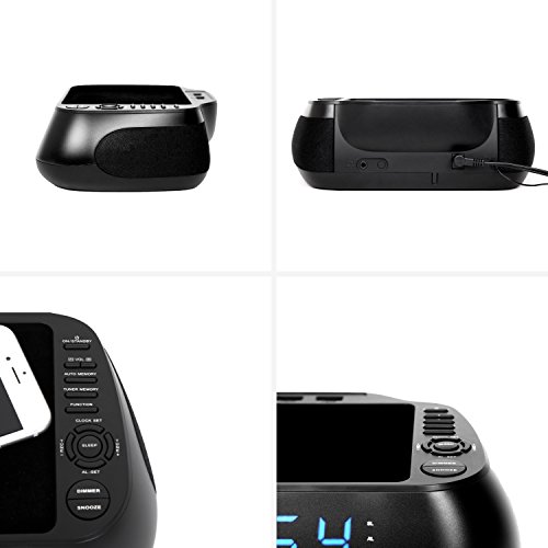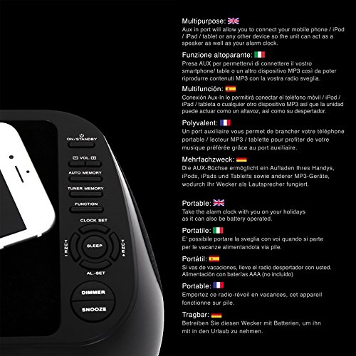 CONNECT TO YOUR IPHONE OR SAMSUNG SMARTPHONE VIA AUX – Aux in port will allow you to connect your mobile phone / iPod / iPad / tablet or any other MP3 device so the unit can act as a speaker as well as your alarm clock. Operated by UK plug only (supplied); use 2 X AAA batteries for memory only.