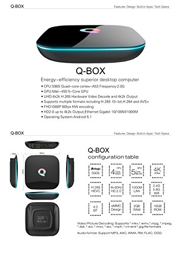 EVANPO Q Box Smart TV Android Devices is with Android 5.1 Lollipop OS, powered by Quad core Amlogic S905 Cortex A53, includes a 5-Core GPU that can reach speeds of up to 2.0GHz, more than 4 times performance improvements.