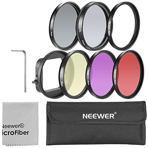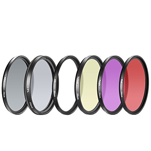 Kit includes:(1)58mm Lens Filter Ring Adapter + (6)Filters(Red + Yellow + Purple + UV + CPL + ND4) + (1)Microfiber Cleaning Cloth + (1)6-slots Wallet for Filter