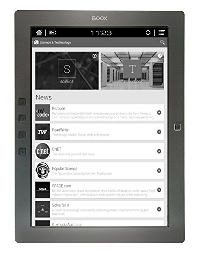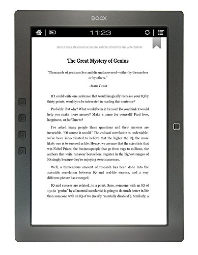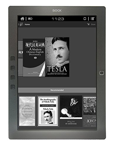 Android 4.0 Smart OS Android 4.0 samart operation system, better compatibility, stronger expansibility and wider applicability; well-integrated features like purchase, download, reading, sharing, note-taking, make your reading more enjoyable; full-screen touch full-screen capactive touch with fingers for easy navigation, makes note-taking, annotation, pageturn easily managed. Typical button, easy navigation physical function keys on the left side, classic five-way navigation key on the right side, easy to operate, combining full screen touch, makes it easy to manage your Boox WiFi + Bluetooth 4.0 Speed enhanced WiFi Cable and Quick and stable connection, convenient open broswer, text download, reading online and surfing internet; Built-in Bluetooth 4.0, WiFi without limitation , Easy communication and efficient data transmission; Speaker + Earphone Built-in speaker of 9.7 inch e-reader with 3.5 mm earphone audio output, Support TTS, Audio books and music play, let your eyes and ears enjoy reading and listening at the same time; 4GB storage + SD Card Built-in 4GB storage, and expandable SD card up to 32GB Allows you to store thousands of books in one device. Portable books could be ready at any time you like; multi-format support without convert, 15 kinds of text format could be read directly including text format: PDF/EPUB/TXT/Mobi/CHM/DJVU/HTML/RTF/FB2/Doc/PDB, Picture: JPB/PNG/BMP, Audio format: MP3/WAV format. Slim body only 11 mm thick with 520g, thinner and lighter than a 300 pages maganize; Size: 241x178x11 mm