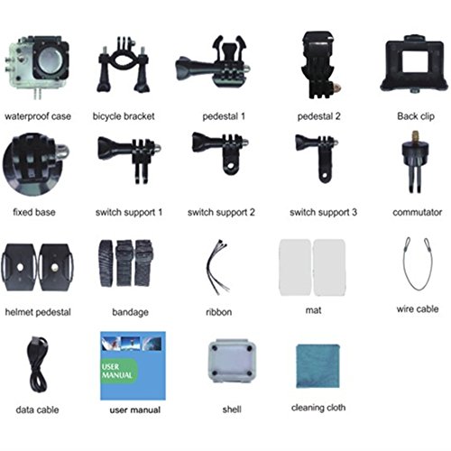 Product description Note: 1. Make sure you get a C10 or above Micro SD card with the storage at least 8G and at most 32G 2. When you use the action cam for the first time, please make it fully charged for long lifespan. Hardware Specification Image Sensor: Type 20MP,COMS OV4689 Backend chipset(DSP): CPU Sunplus 6350M, Sunplus manufacturer Len: Type: Fixed focus Burst Shot .Open Aperture: F2.8 .Actual Focal LengthL 2.8mm. View Angle: 170 degree Back Display: Panel Type-TFT 262K color,Panel size 2.0,Resolution 240×320, support Brightness Adjust Storage media: internal memory 1Gb DDR3 Embeded, External memory Micro SD Firmware Specification File Format: movies MP4/MOV(H.264/MJPG),photo JPG Image Resolution: 5152×3864(20MP)/4896×3672(18MP)/4288×3216(14MP)/4000×3000(12MP)/3648×2736(10MP)/ 3264×2448(8MP)/2592×1944(5MP)/2688×1520(4MP)/1920X1080(2MP)/640X480(VGA) ISO: 100/200/400/800/1600/Auto White Balance: Automatic, daylight, fluorescent , incandescent, cloudy Burst Shot: 3/5/10 per second Self-Timer Mode: Single Shot/ Delay Shot(10s,2s)/ Burst Shot Time lapse: 1s/2s/5s/10s/30s/60s Video Resolution: 4K:3840*2160@10fps; 2.7K @15fps; 1920*1080 @60fps; 1920*1080 @30fps; 1280*720 @120fps; 1280*720 @60fps; 640*360 @240fps;1280*720 (SlowMotion)@30fps;640*360 (SlowMotion)@30fps Multi-language: English / Francais / Deutsch / Espania / Italiano/Italian/Portuguese Japanese/polish/Korean/Dutch package: 1*waterproof case 1* blcycle bracket, 1*pedestal 1, 1*pedestal 2, 1*back clio, 1*fixed base, 1*switch support 1, 1*switch support 2, 1*switch support 3, 1*commutator, 1*helmet pedestal, 1*bandage, 1*ribbon, 1*mat, 1*wire cable, 1*date cable, 1*user manual, 1*shell, 1*cleaning cloth