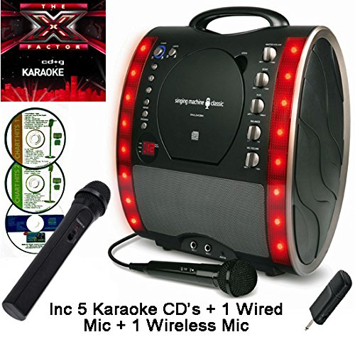 X Factor CD Version PARTY PACK No 3: As well as the Karaoke machine, this party pack includes 86 karaoke songs (5 CD’s – worth an extra £59.98 separately for the extra 4 CD’s, compared to the standard machine pack of 1 karaoke CD) + 2 Mics (1 Corded and 1 Cordless) – Fantastic offer price, saves £’s compared to buying separately